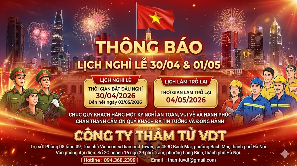 CỘNG HÒA XÃ HỘI CHỦ NGHĨA VIỆT NAM Độc Lập – Tự Do – Hạnh Phúc —————————– THÔNG BÁO (V/v: Thông báo lịch nghỉ Lễ 30/4 và 1/5/2026) Công ty TNHH Cung cấp thông tin Việt Nam ( hay còn gọi là Công ty Thám tử VDT) được thành lập ngày 01/02/2005, trải qua 21 năm hoạt […]